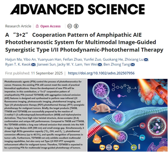 近日,新葡京娱乐场 马海军副教授与厦门大学、清华大学、香港科技大学、香港中文大学(深圳)合作在国际综合性高水平期刊Advanced Science上发表了题为“A‘3+2’Cooperation Pattern of Amphipathic AIE Phototheranostic System for Multimodal Image-Guided Synergistic Type I/II Photodynamic-Photothermal Therapy”的研究论文。论文第一作者为马海军副教授,通讯作者为厦门大学陆治香教授、清华大学危岩教授、香港科技大学Ryan T.K.Kwok教授和香港中文大学(深圳)唐本忠教授,新葡京娱乐场 为第一署名单位。本研究针对常规光诊疗剂在肿瘤诊疗过程中存在光漂白及功能单一等缺陷导致效果不佳的问题,我们设计开发了一种“3+2”复合模式的双亲性AIE光诊疗剂—TDTMSB,其展现出长发射波长、大Stokes位移(300 nm)、较小的能级;同时,TDTMSB具有高活性氧生成能力(1O2, ·OH和·O2−)和光热转化效率(40.5%)。此外,TDTMSB对恶性肿瘤可实现荧光成像、光声成像、光热成像的多模态成像效果以及I/II型光动力治疗(PDT)协同光热治疗(PTT)的光疗作用。研究结果将为多功能纳米诊疗系统的设计开发提供新策略。文章链接://doi.org/10.1002/advs.20250795