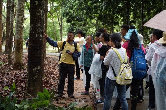 下午参观热带沟谷雨林,并在蔡希陶等群雕像前合影留念。谷雨林风景区内河谷纵横,森林茂密,一片热带雨林风光,由于地形影响,造成了局部小低压,气流上升,容易形成降水,且因处于热带亚热带地区气候炎热,这时就形成了局部的雨林气候,且有着和雨林气候同样的特征,高温多雨,由于这种地形造就该地区的植被。品种繁多的热带植物遮天蔽日,龙树板根、独木成林、老茎生花、植物绞杀等植物奇观异景随处可见。
