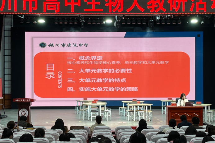 示范课结束后,银川六中生物学教研组组长萧乐老师和银川唐徕中学陈福湘老师分别以《核心素养背景下高中生物情境教学实践研究》和《基于核心素养,聚焦学科实践——银川市唐徕中学高中生物组大单元教学的实践与探索》为主题做了专题讲座,阐释了两堂示范课的理论依据和设计思路。萧老师形象地将“知识”比作“汤”“情境”比作“盐”,情境则可以使课堂更加生动、有趣,倡导教师积极应对时代变化赋予我们的挑战,将情境教学融入课堂教学和测试任务中。陈老师提出,现阶段我国生物学教学正在由知识导向转为素养导向,教师应打破教材顺序,构建跨章节、跨学段的教学设计,培育学生解决复杂社会议题、抵御人工智能的能力。