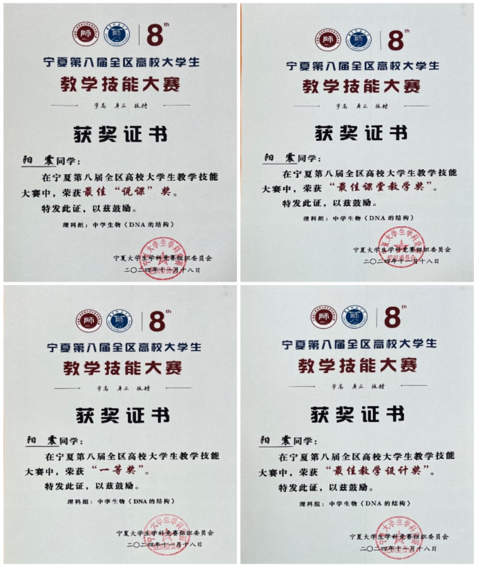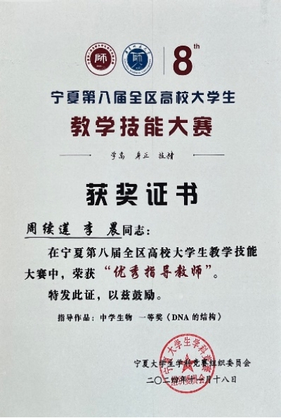 、北方民族大学、宁夏医科大学等18所高校的199名学生入围决赛。我院2021级生物科学(师范)专业本科生阳震在此次比赛中表现卓越,荣获理科组(中学生物)一等奖,并斩获“最佳教学设计奖”“最佳说课奖”“最佳课堂教学奖”三个单项奖。同时,我院师范教育教研室周续莲老师、李晨老师荣获“优秀指导教师”奖。