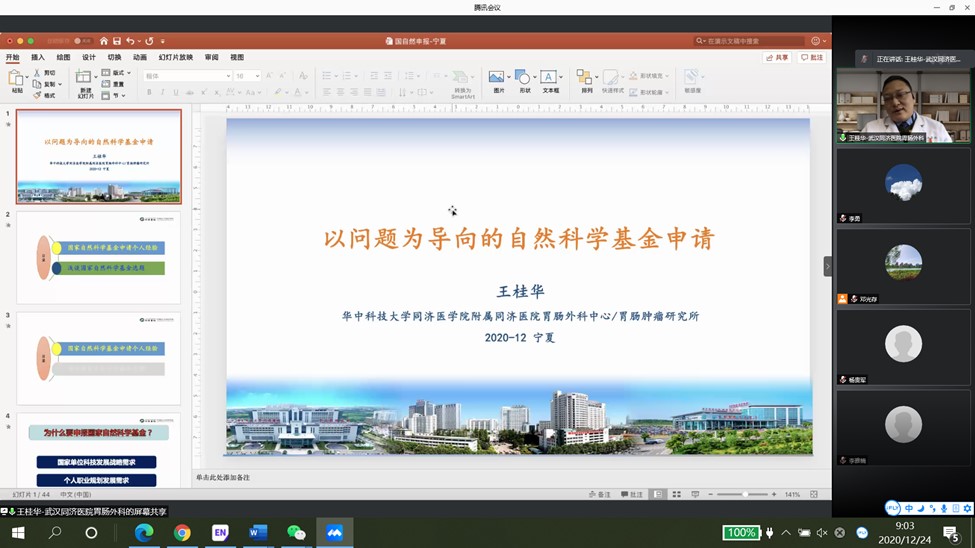为了进一步推进我院国家自然科学基金项目申报工作,12月24日,我院邀请了华中科技大学同济医学院附属同济医院胃肠外科中心医学博士、国家自然科学基金优秀青年基金获得者王桂华教授在线作了“以问题为导向的自然科学基金申请”专题报告会。王桂华教授结合自己的申报和评审经验,从国基金申报的总体策略和具体细节两个层面、从申请人和评审专家两个角度详细讲解了国基金申报中的一些共性问题和个性问题,提出了一些针对性很强的建议,并对老师们提出的问题进行了耐心解答。相信通过本次报告会,对于我院教师申报国基金将具有很好的启发和借鉴意义。会议由邓光存副院长主持,我院教师和研究生60余人参加了会议。