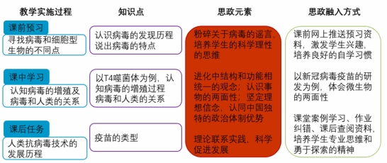 部门文件教务处[2021]50号)。通过微生物学的教育教学,在教学过程中重点强化科学素养、创新意识、人文情怀的教育,把科学精神、探索精神、创新精神、辩证思维、生物安全、伦理道德、克忠职守、以微见著、生态文明、可持续发展、团队精神、职业道德、政治认同、人民至上、生命至上、责任担当、家国情怀和文化传承等课程思政教育内容有机地融合到微生物学教育教学实践活动之中,在微生物学知识传授、能力培养和价值塑造过程中,达成立德树人的教育目标。