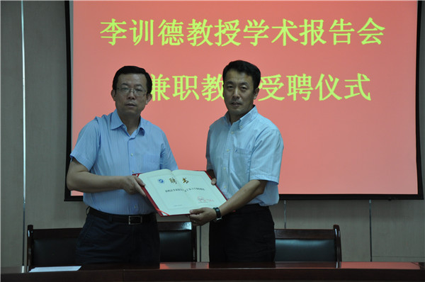 在学术报告会前,学院举行了隆重的兼职教授受聘仪式,王玉炯院长为李训德教授颁发了聘书。